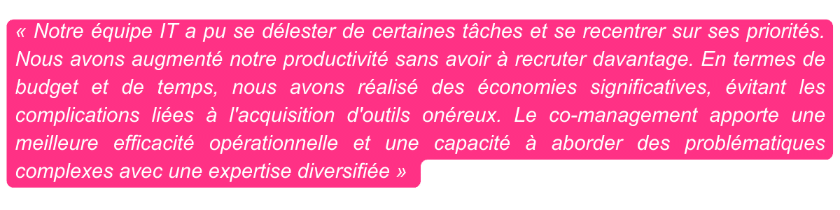 Notre collaboration permet d'améliorer la qualité de service et de libérer du temps pour votre équipe IT afin qu'elle se focalise sur des enjeux stratégiques.